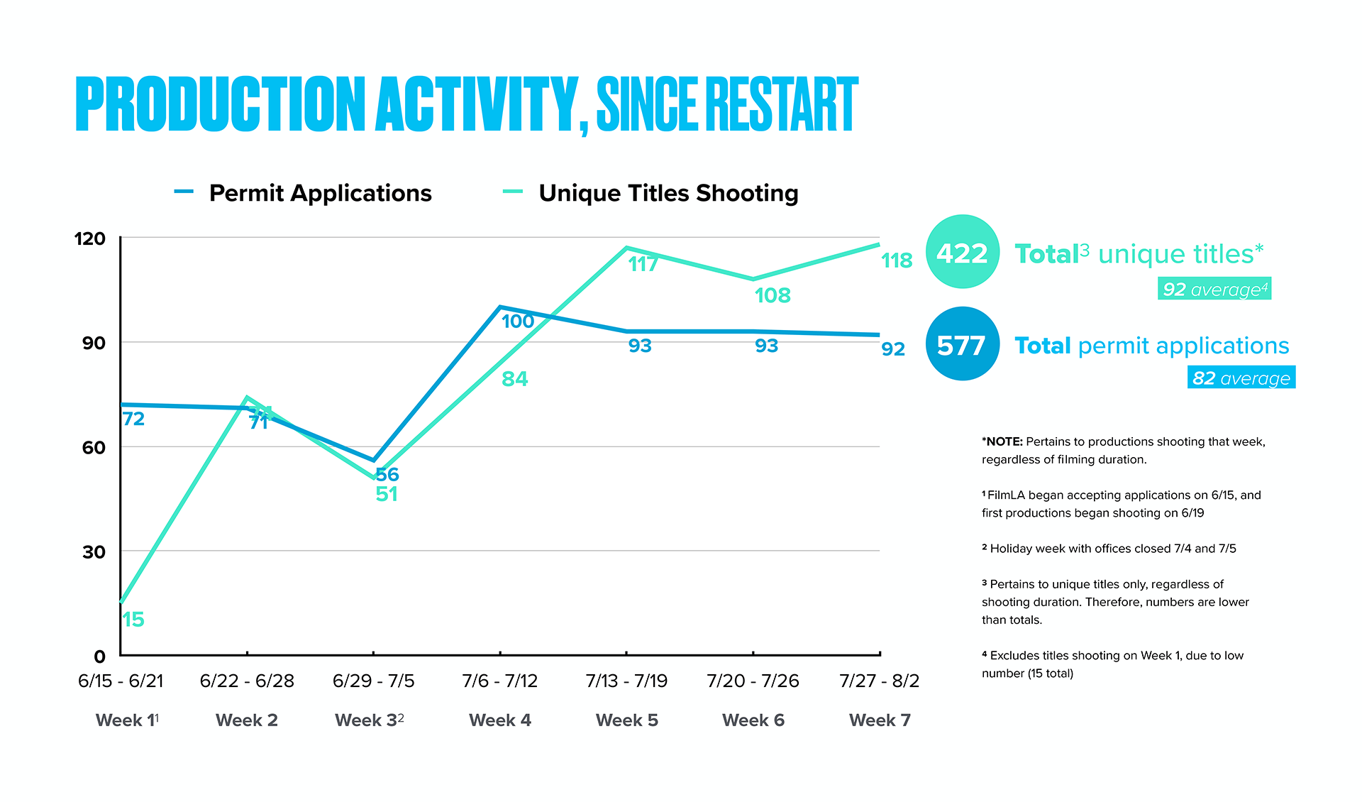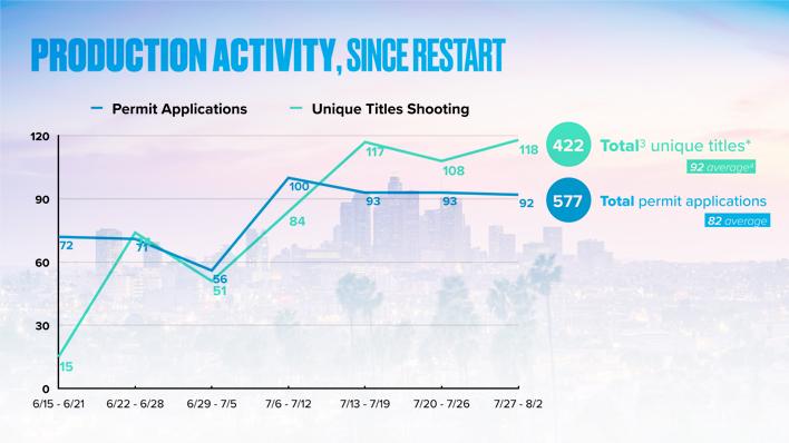 After receiving the go-ahead from local authorities to begin processing film permits, FilmLA resumed remote office operations on June 15. Limited filming activity was underway in the region by June 19.