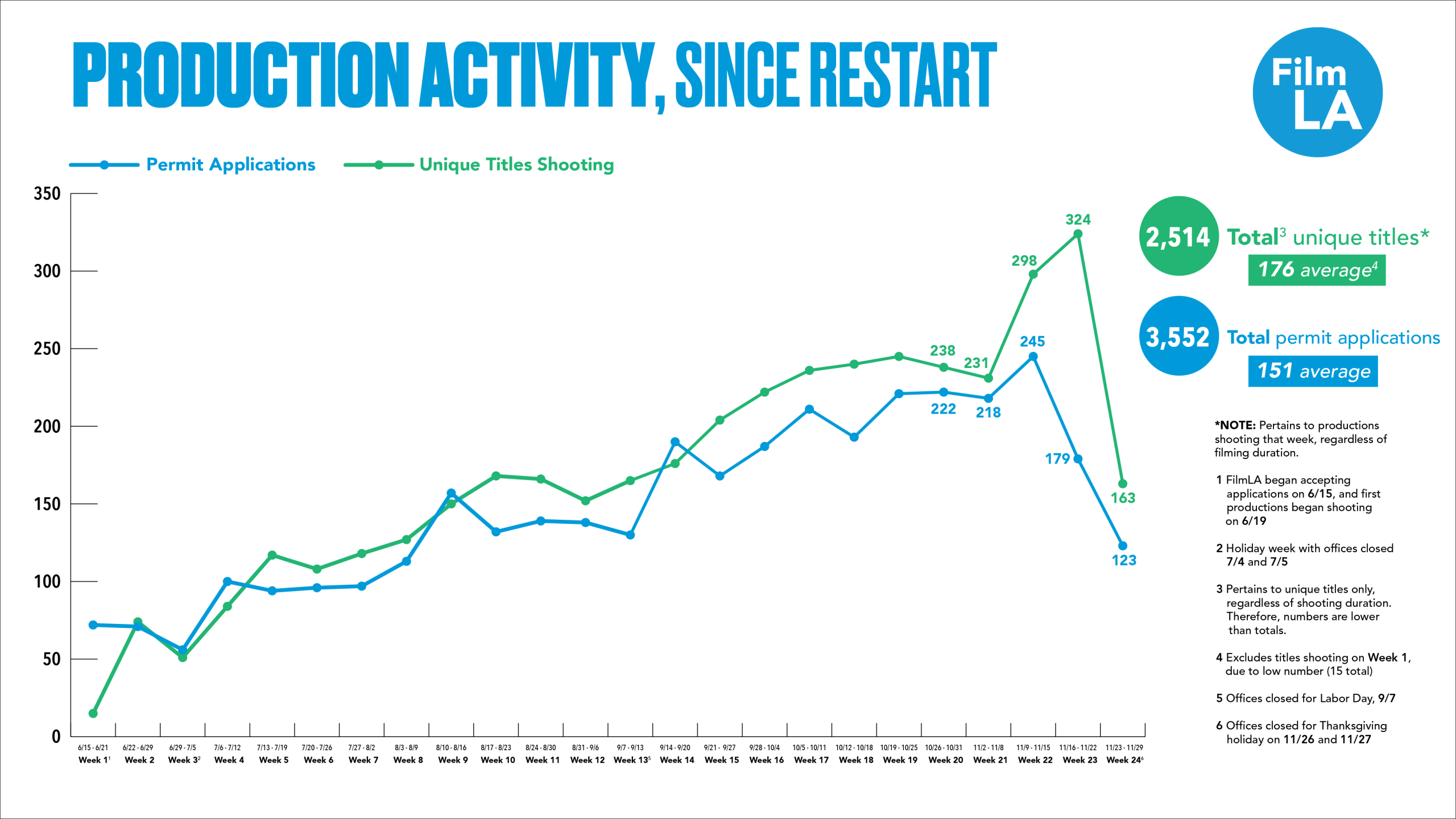 “The November decrease in production reflects the ongoing complexity of the moment. At this point, progress for production rests, like so many things, on effective community control of COVID-19. The Greater Los Angeles filmmaking community, so fortunate to be able to remain working, continues to be mindful of safe set rules.”
